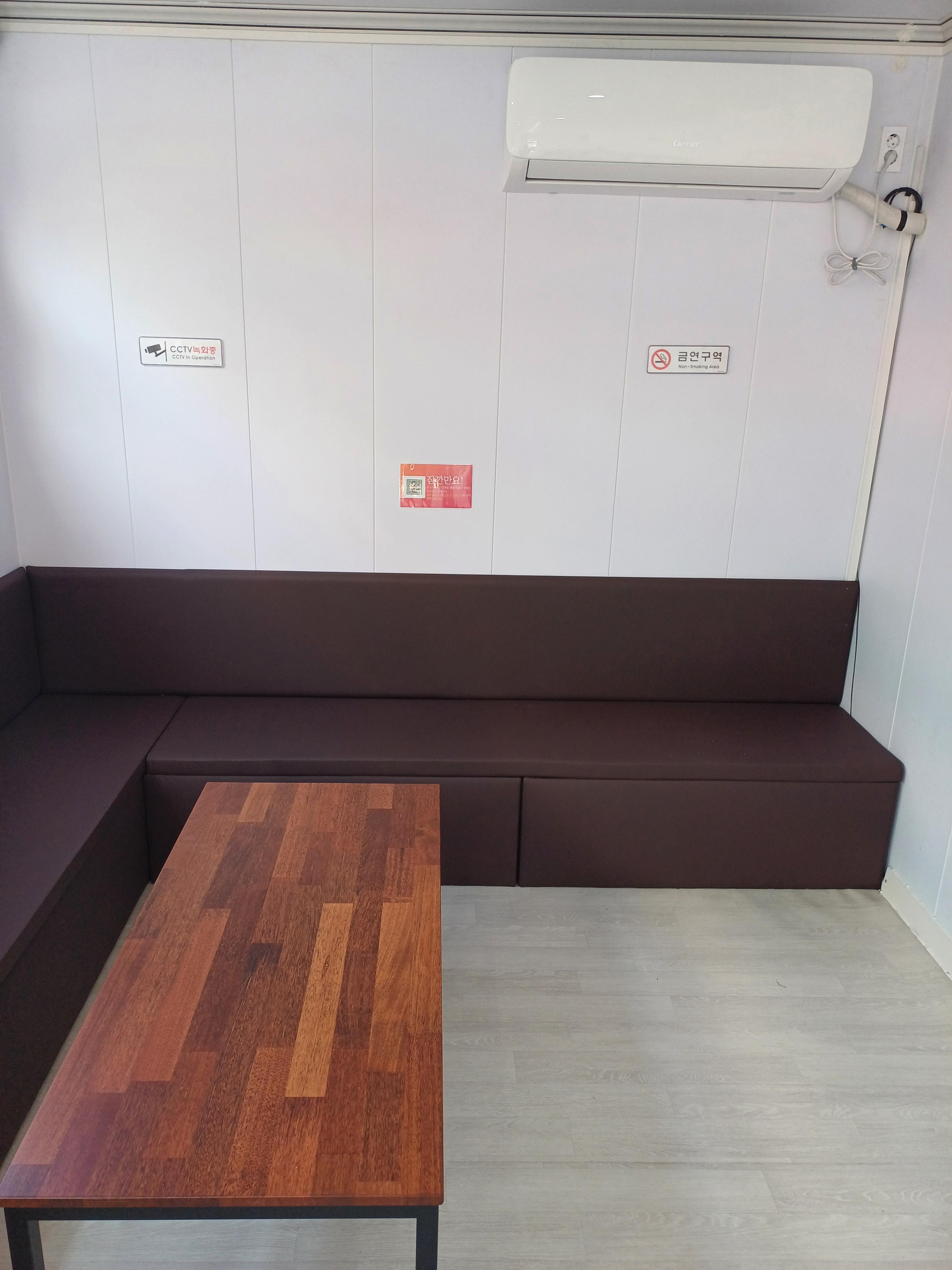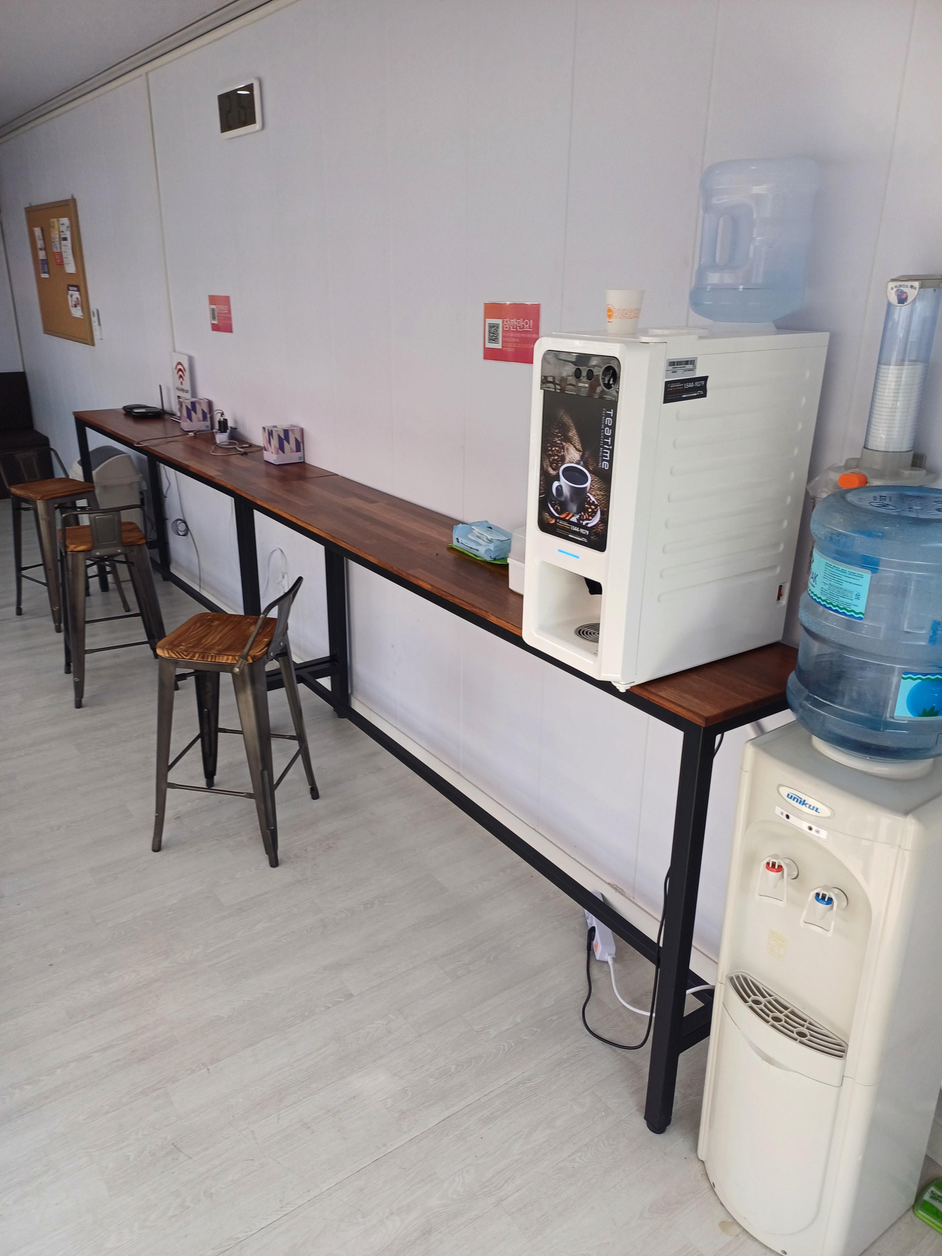 실내공간에는 무료로 이용가능한 테이블, 소파, 커피머신, 물티슈, 구급상자가 있었습니다.