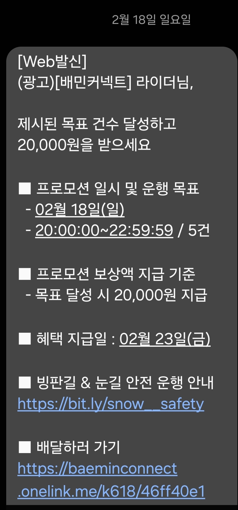 오늘은 비가와서 그런지 배민커넥트에서 5건 배달완료시 2만원 추가지급 이벤트 프로모션을 받았습니다.